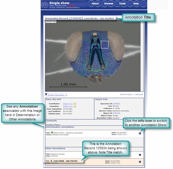 This is an example of an annotation record page displayed from the My Manager > Annotation Tab > information icon Info Icon. Morphbank Single Show is an efficient way to display large amounts of information. For complete documentation on single show refer to Morphbank Show in the Information Linking section of this manual.