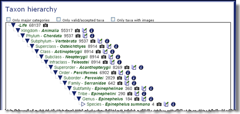 Additional data about the image can be viewed using the i icon icon. Additional data about the taxonomic name can be viewed using the Taxon Hierarchy hierarchy button icon